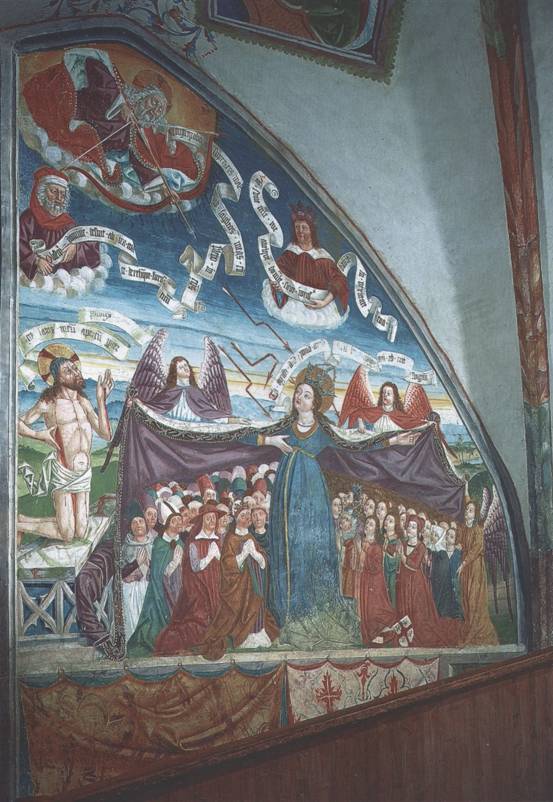 Die durch Körpergröße und von der Bildkomposition her herausragende Gestalt ist Maria; sie „beherrscht“ die Szene. Der weit ausgespannte schmuckvolle Mantel und die vielen darunter versammelten Menschen betonen zusätzlich die Bedeutung Marias in diesem Bild. Ihr langes, unter der Brust zusammengehaltenes blaues Kleid verweist nach mittelalterlicher Allegorese auf ihre Jungfräulichkeit, ebenso ihr offenes Haar, das nicht wie bei verheirateten oder klösterlichen Frauen „unter der Haube“ verborgen ist. Auf ihrem Haupt hat sie eine Bügelkrone, wie sie auch der Kaiser neben ihr im Bilde trägt.[5] Dahinter leuchtet der goldfarbene Nimbus als Kennzeichen der Heiligkeit. Ihr Gesicht wendet sie halb nach oben zu ihrem Sohn und zu Gottvater hin; das unleserliche Spruchband über ihrem Haupt läßt leider nicht erkennen, was Maria sagt und wer genau der Angeredete ist.[6] Von den fünf Spruchbändern ist dieses am stärksten ausgewaschen oder verwittert und mit den mir zur Verfügung stehenden Mitteln nicht zu entziffern.